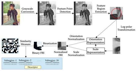 A change in the scale of the feature region in the Cartesian coordinate system leads to a shift in the transformed image in the radial direction in the Log-polar coordinate. The radius increases as the feature region scaled up and decreases as the feature region scaled down. A good representation of the scale can be used to normalize the feature region to the same reference size. The orientation of the feature region can be represented as the orientation of the vector from the center of the feature region to its intensity centroid. All feature regions must be normalized to have the same scale and orientation before calculating their SYBA descriptors for matching. The block diagram of SR-SYBA algorithm is shown in Figure 2.