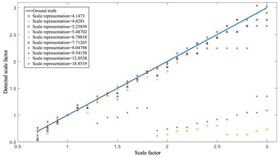 As shown in Figure 9, for the feature region with a scale representation of 8.048 (blue star), the last two scale factors (2.9 and 3.0) were very close to its allowable limit and were slightly off of the ground truth. For the feature region with a 9.54 scale representation (orange circle), the last six scale factors exceeded its detectable limit of 2.51 (24/9.54) and were not estimated corrected. Similarly, for scale representations 12.05 (yellow triangle) and 18.85 (purple cross), their respective allowable limit was 1.99 and 1.27. Only twelve yellow triangles (scale factors 0.7–1.8) and six purple crosses (scale factors 0.7–1.2) were estimated correctly. The larger the scale representation, the smaller the number of correct scale factors that can be estimated correctly.