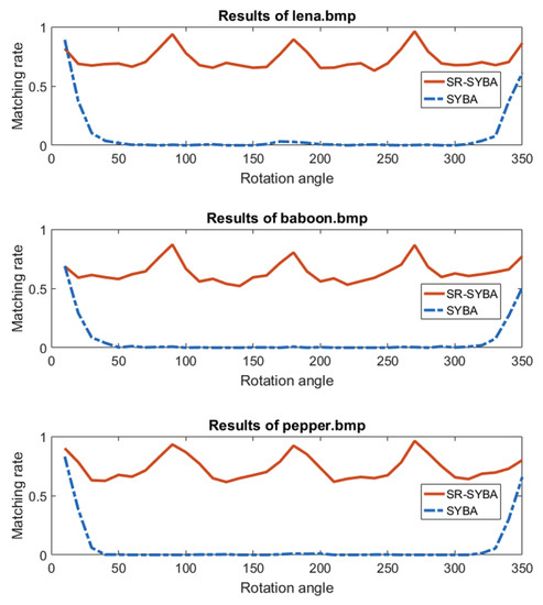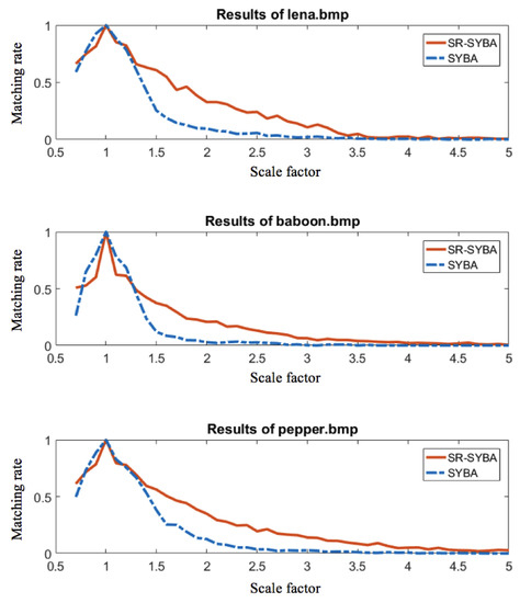We compared SR-SYBA’s matching performance with the original SYBA under the same experimental settings to demonstrate its scale and rotation invariance. We selected three standard images that are commonly used for image processing: Lena, Baboon and Pepper, as shown in Figure 10.