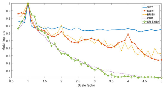 We compared our SR-SYBA feature descriptor with other feature description algorithms in the cases of scaling and rotation variations. The experiment settings were similar to the ones in Section 4.2. Lena was used for these experiments. We tested the matching performance of each algorithm after the image was resized by 0.7–5.0 at a 0.1 interval. Similarly, Brute Force matching and matching rate were applied. ORB feature detection was again used for SR-SYBA feature detection. SIFT, SURF, BRISK, ORB, and SR-SYBA were included in this comparison. The original SYBA and the improved rSYBA were not included in this experiment because the comparisons in Section 4.2 and Section 4.3 already demonstrated SR-SYBA’s superior performance. The experimental results are shown in Figure 13.