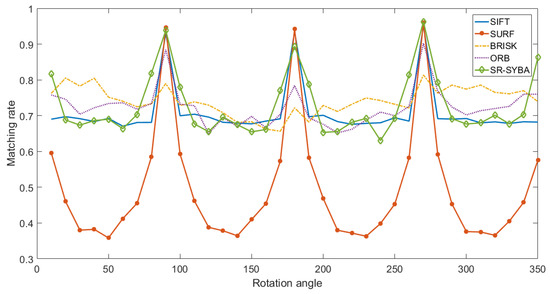 As shown in Figure 13, SIFT, SURF and BRISK performed better under such experimental settings. The performances of SR-SYBA and ORB were close, while SR-SYBA was better for smaller scale factors and ORB was better for larger scale factors. Similar test for rotation variation was also performed for these algorithms. The Lena image was rotated by 10–350 degrees at a 10-degree interval. Figure 14 shows that most feature description algorithms provide rotation invariance. SR-SYBA provided the best rotation invariance. Its matching rate curve reached the highest peak and dropped slower than other algorithms when rotation angle moved away from 90, 180, 270, and 360 degrees.