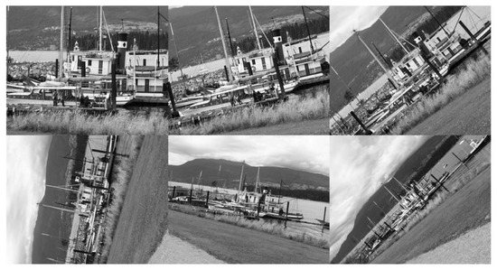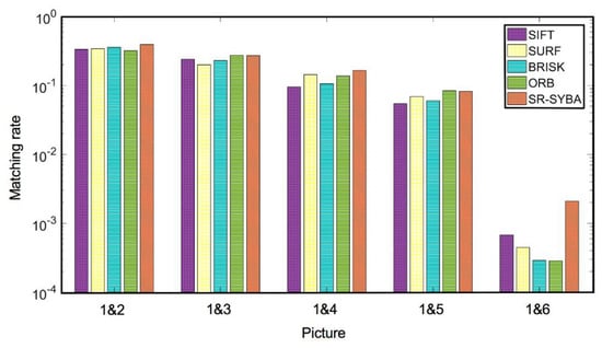 We used the boat image sequence from Oxford Affine dataset [26] for evaluation. This image sequence has six images of the same scene with increasing shooting distance and angle, as shown in Figure 15. The first image was used as the reference image, and the other five images were matched to the reference image individually. The correct matching points were filtered through the affine matrix provided by the dataset. We used the same matching rate defined in Section 4.2 as the criteria for evaluation. The results obtained by SIFT, SURF, BRISK, ORB, and SR-SYBA algorithms respectively are plotted in histograms in Figure 16. The vertical axis (matching rate) was scaled to logarithmic for ease of comparison.