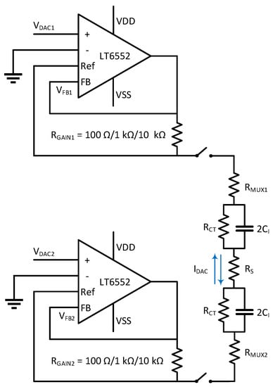 The voltage-controlled bipolar current sources in Figure 2 used an amplifier with auxiliary differential inputs (LT6552, Linear Technology, Milpitas, CA, USA), and either current source was able to sink or source current. The auxiliary input was used in a feedback loop to force the equivalent voltage of across the output resistor . Therefore, in order to balance the current sinking and sourcing, the input voltage and must be differential. The resulting output current for each channel is given as: