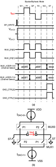 (a) Example timing for biphasic, bipolar stimulation and (b) the resulting stimulation circuit.