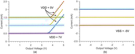 To verify the compliance voltage of the stimulator, we swept the load voltage on the source meter for programmed currents (Figure 5). For anodic stimulation, the current output deviated from its specification by 10% around 3.6 V (VDD − 1.4 V). To ensure 5 V compliance, a VDD of 7 V could be used. Cathodic stimulation, however, was compliant with VSS due to the input common-mode range of the current source amplifier.