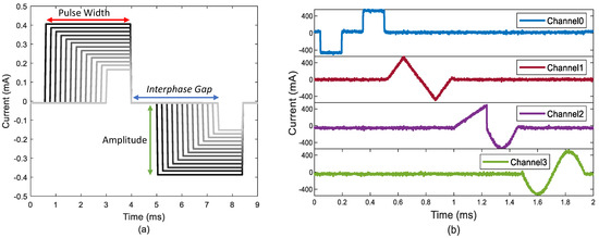 (a) Pulse width, interphase gap, and amplitude for both positive and negative pulse are customizable and (b) arbitrary waveform done using lookup table update.