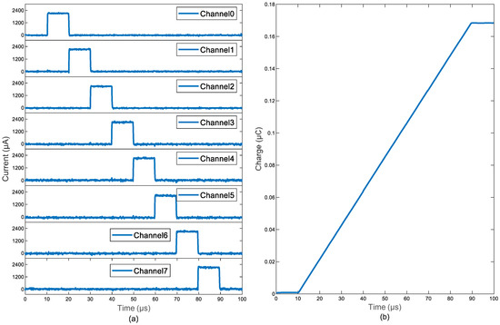 To demonstrate an intersectional short pulse (ISP) [8] stimulation protocol, we measured the voltages across eight resistive loads with 1 k resistance, and they were connected to the corresponding output channels of the stimulation system. The pulse current amplitude was set to be 1 mA and the pulse width to be 10 s in Figure 10a. The overall charge accumulated at the theoretical focal point showed a linear increase over time (Figure 10b). The ISP function was implemented by updating the DAC via a single lookup table and switching the MUX address incrementally from Address 0 to 7, so the stimulation current pulses were directed to preassigned output channels.