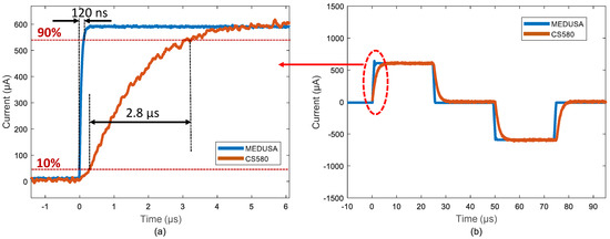 The rise time for the MEDUS system and SRS CS580 is 120 ns and 2.8 s, respectively (a), measured across a 1 k resistive load from 10% to 90% of voltage, (b) and the 10 kHz stimulation.