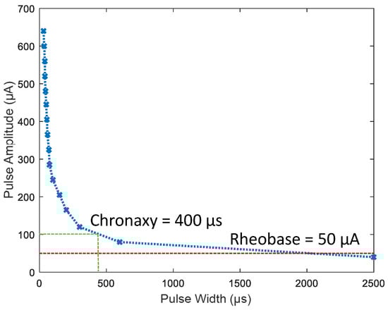 To build a strength-duration curve (Figure 13), we used monophasic current stimulation and swept pulse width and amplitude to determine the action potential threshold for the median giant nerve (MGN). Stimulation frequency was below 0.5 Hz to ensure that the nerve was not fatigued. The MGN showed a rheobase current of 50 A and a chronaxy of about 400 s [21].