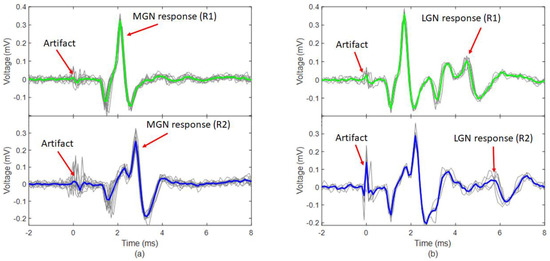 To verify a response from the lateral giant nerve (LGN), we used a fixed 100 s monophasic current pulse and increased amplitude starting at 200 A. Due to its smaller diameter, the LGN had a higher threshold and slower conduction velocity relative to the MGN. Figure 14a shows stimulus amplitudes below the LGN’s response threshold, while Figure 14b shows the response for stimulus amplitudes above the threshold. By comparing the delay between recording channels (R1 to R2), we estimated the conduction velocity of the MGN and LGN to be 20.0 m/s and 7.7 m/s, respectively.