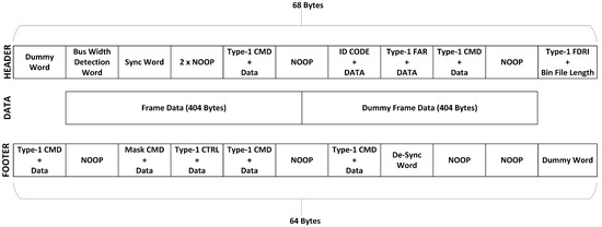 To introduce bit flips, we require to Read-Modify-Write the PL frames in a similar fashion as ICAP does. As previously stated, Xilinx neither allows module-level partial reconfiguration once IDF is enabled nor provides any library support for run-time partial bit-stream generation. To work around this problem, we studied the bit-stream structure of 7- Series FPGAs [26] and successfully reverse engineered the partial bit-stream structure. Using [26,27] and many generated bit-stream’s (full and partial) we devised a template, namely Partial Frame Template (PFT). The PFT contains all the necessary header and footer sequences (Refer Figure 1) that are required to target any 7-Series FPGA frame. PFT allowed us to generate our own partial FPGA configuration files without going through the extensive process of Vivado’s bit-stream generation, all in run-time. All the commands and frame data in the PFT were kept in SMAP x32 mode as we used PCAP to deliver configuration file to PL. Also, it is a requirement for PCAP that binary swapping of binary files must be disabled when targeting PCAP or MCAP [27]. It is to be noted here that PFT could only be loaded to the design, once the CRC check was disabled in original design file, as the partial bit-streams contain the CRC verification functionality, as a countermeasure to prevent faulty designs from loading onto PL which can cause permanent damage. Bit-stream CRC generation information is Xilinx proprietary and serves as a fail-safe. However, for our test and purposes it introduced an additional overhead thus, we bypassed it, saving time. After bypassing the CRC check, our PFT was able to load and configure any targeted PL frame, successfully. The contents of our proposed PFT are shown in Figure 1 for the reader’s understanding while Figure 2 shows the process to use our PFT to help readers, better follow the flow of our proposed methodology.