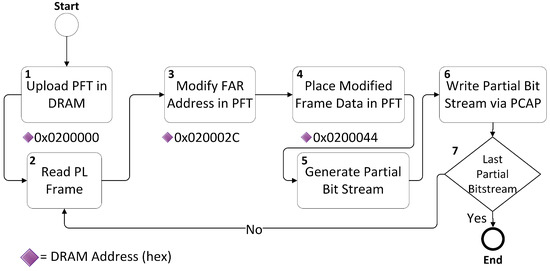 The evaluation process of IDF begins by uploading a Partial Frame Template (PFT) in PS DRAM containing all the necessary, Synchronization header, Frame Data, Dummy Frame Data and De-Synchronization footer sequence for 7-series FPGA [26]. After PFT is loaded, a frame is read back using PCAP and written to the same Frame Address register (FAR) location with a difference being that 1-bit is now flipped from its original state to emulate the effects of an SEU in a controlled environment. Prior to this process, the clock of the HW evaluation part is stopped to better observe the results of FI introduced in the system.