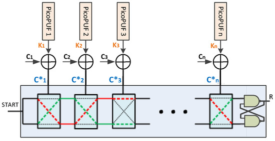 The XMPUF design, an example of the Multi-PUF design, is composed of n PicoPUF designs and a n-stage APUF design. The mathematical model for the output of the XMPUF design is the same as the Multi-PUF design as Equations (1) and (3). For the XMPUF design, XOR operation is used as an obfuscation function, , to generate a challenge from an original challenge . At the stage, the challenge is defined as Equation (9).