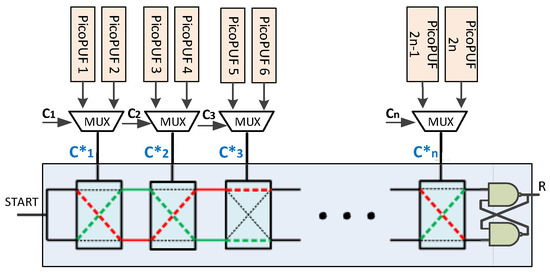 Obviously, the reliability of the Weak PUF is critical to the performance of the overall Multi-PUF design. Some types of Weak PUF designs have demonstrated high reliability with/without post-processing techniques, e.g., DRAM PUF [27], FPGA-based PUF ID generator [28], etc. The lightweight and reliable PUF ID generator design [28], which was referred to as PicoPUF, was used to show the feasibility of the Multi-PUF design. In Reference [28], it has been presented that the PicoPUF design can achieve almost 100% reliability through a lightweight post-processing. Generally, any type of Strong PUF can be used to construct the Multi-PUF design, e.g., APUF [5] or FF-APUF [29]. In this scheme, the challenge to a Strong PUF is completely obfuscated by Weak PUFs. As an example, the previously proposed XMPUF design [18], shown in Figure 3, is composed of n PicoPUF designs and an n-stage APUF design. The response of the PicoPUF is XORed with the challenge bit to mask the original challenge bit and a new challenge bit is generated. is the challenge input into the Multi-PUF and is the challenge generated from the PicoPUFs, which are used as the challenges for the APUF.
