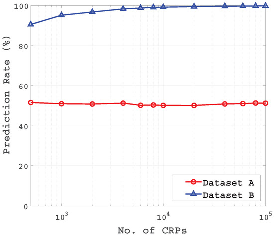 As discussed in Section 3.2, the delay difference of the XMPUF design can be expressed as . It is necessary to transform the challenge vector to feature vector to build up an accurate delay model since there is no linear relationship between challenge vector and delay difference . Figure 5 presents the LR modeling results on the XMPUF design using two feature vectors, C and , respectively. Dataset A is the result which uses feature vector , while Dataset B is the result which uses feature vector C. It has been shown that the LR achieves almost 100% attacking accuracy by applying the feature vector . In a contrast, it is difficult for the LR to train and figure out an accurate model by directly applying the feature vector C.