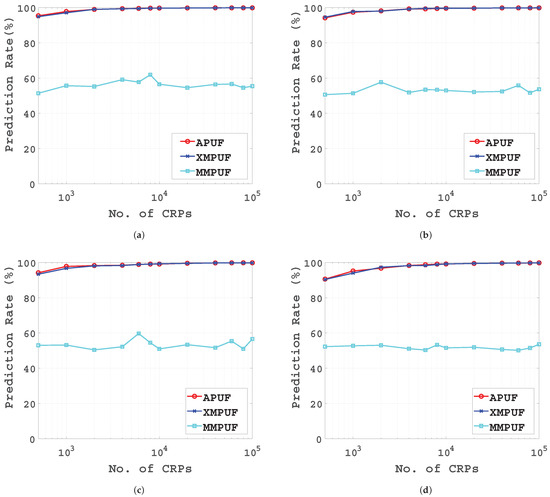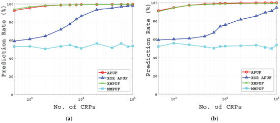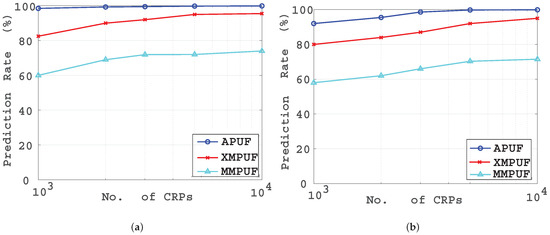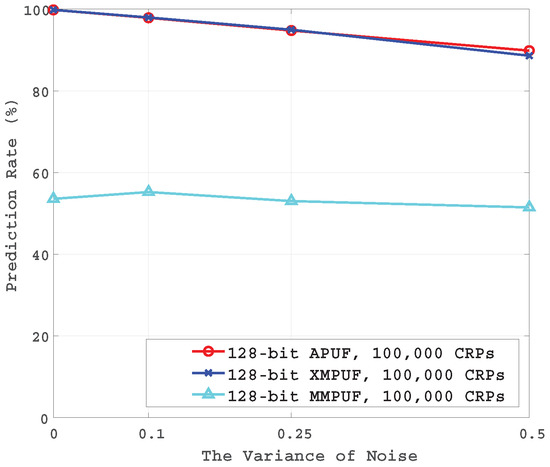 It can be seen that the prediction rates of both the conventional APUF and XMPUF decreased slightly with increasing variance of the . With a larger sample size of CRPs, the prediction rate is still very low as shown in Figure 8.