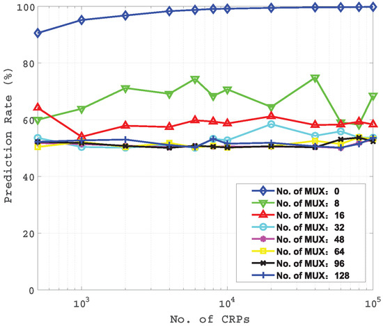 Figure 9 gives the prediction rate of the MMPUF design with different numbers of MUXs. In particular, the top curve is the prediction rate for the conventional APUF design with a training sample size from 500 to 100,000 and the number of MUX is 0. The curve which uses 128 MUXs is the prediction rate for the MMPUF design.