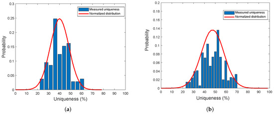 Figure 14 shows a histogram of the uniqueness results for the proposed MMPUF design. The uniqueness of the proposed MMPUF design achieves an empirical mean of % on Artix-7 FPGAs and % on Kintex-7 FPGAs. The uniqueness on Artix-7 FPGA is equivalent to the uniqueness value of the FF-APUF design [29] while the result on Kintex-7 FPGA is better. The reason may be that the Kintex-7 FPGA has higher performance and speed compared with Artxi-7 and this could increase the uniqueness of the proposed MMPUF. Moreover, compared to the uniqueness results from 5.44% to 10.82% achieved by the work [25] on Multi-PUF, the proposed MMPUF design demonstrates a higher capability to differentiate between different devices.