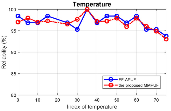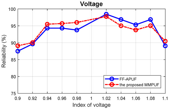 The temperature is in a range of 0 °C∼70 °C using a convection heat chamber while the core supply voltage was varied by volts using a DC regulated power supply. A previously proposed post-characterization methodology [28] is adopted to improve the reliability of the PicoPUF, which has been presented to achieve almost reliability. Figure 15 and Figure 16 show the reliability results of both the FF-APUF and proposed MMPUF designs. The average reliability results of the proposed MMPUF design on Xilinx Artix-7 FPGA over temperature and voltage experiments are 96% and 94%, respectively. Due to the limitation of the evaluation board, the reliability of the proposed MMPUF design over temperature variations on Kintex-7 FPGAs are carried out and is 96.65%. By using the post-characterization for the PicoPUF design, the proposed MMPUF design achieves a similar reliability result as the FF-APUF design. Hence, the proposed MMPUF design can achieve modeling attack resistance without sacrificing reliability or uniqueness performance in practice.