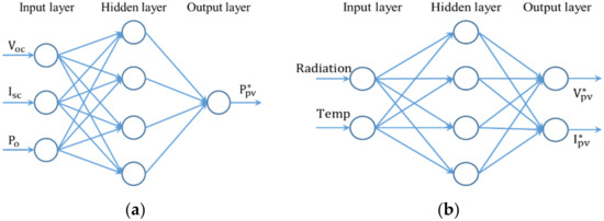 Neural networks have advantages such as robust operating, fast tracking, non-linear system processing power, and off-line training, and they are used in various ways for the MPPT of PV systems [45,46,47,48,49,50,51,52,53,54,55,56,57,58,59,60,61,62]. Nonetheless, the MPPT method using a neural network has a disadvantage of increased cost because a high-performance microcontroller is required compared to other methods. Neural networks are generally composed of three layers: input layer, hidden layer, and output layer. The number of nodes in each layer is used varyingly depending on the user who designs the controller. When MPPT control using a neural network is classified according to the type of input value, it can be divided into a method of using an electrical signal, a method of not using an electrical signal, and a method of mixing the two signals. The electrical signal input is the same as the voltage and current of the PV module, and the non-electrical input is the same as the temperature and radiation. The output includes reference power (), reference voltage () and reference current () for tracking the maximum power point of the PV system; by using this, the maximum power point is adjusted by adjusting the duty ratio of the power converter to track. Figure 16 shows the type of neural network classified according to input.