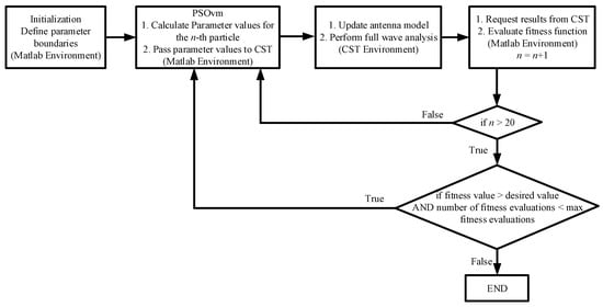 In this paper, the preferred optimizer is an improved (PSO) [15] algorithm that induces mutation to the particles’ velocities that did not improve their fitness value in the previous iteration (PSOvm) [16]. The idea behind this method is to help the particles that failed to improve their fitness value in the previous iteration, decouple from their previous velocity which actually did not lead to a fitness improvement. Thus, a perturbation is applied on their previous velocity and by doing so it is expected to help the swarm achieve better exploration and escape when being trapped to a local optimum position. The method has been proved to be very competitive against other well known optimization methods [16] and can handle effectively multi-variable and multi-objective problems as is the case of this paper (the problem consists of 26 optimization parameters and 13 objectives which will be demonstrated in later sections). PSOvm has been implemented in Matlab environment [17]. The AMAA has been fully modelled and simulated in CST Studio Suite (CST from now on) and therefore, the mutual coupling and the element pattern of each array element is considered since full wave analysis is performed. This is really important as it makes the results quite realistic. For each fitness evaluation the antenna array model is updated and a full wave analysis is performed by applying the time domain solver of CST. This solver uses the finite integration technique [18] to solve the electromagnetic problem. Therefore, at each fitness evaluation, the AMAA geometry parameters are updated and the solver simulates the updated model by calling CST built-in visual basic scripts inside the Matlab environment. It is evident that each fitness evaluation is costly in terms of resources and time but the results are highly accurate. In Figure 1 the flowchart of the optimization procedure is depicted. The computer used for the simulations was equipped with an Intel i7 5960X (eightcore) CPU, Nvidia quadro GP100 GPU (suitable for CST GPU-acceleration) with 64 GB DDR4 memory. The CST models employed by the optimization procedure consist approximately of 250,000 mesh cells (as the model changes its dimensions at each fitness evaluation, the amount of mesh cells slightly changes as well), with an average computational time equal to one minute per fitness evaluation. To the best of the authors’ knowledge, evolutionary algorithms have never been applied so far to design an AMMA for broadcasting applications in conjunction with CST.