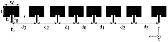 As mentioned before, CST is employed to model and simulate an eight-element AMAA for DVB-T broadcasting at 698 MHz. The feeding network is out of scope for this paper and therefore the array elements are considered to be directly excited at their input ports by sources. The inset feeding method is used in order to achieve better impedance matching to sources. The geometry of AMAA is illustrated in Figure 2 and is defined by the physical dimensions W and L of the rectangular array elements, four distances between the array elements, where (aperiodic structure), the transmission line length and width which connects each array element to its respective source, the inset depth s and the inset width g. PSOvm is employed to find the optimal values for all the above parameters. In order to help the optimization algorithm converge faster, the search space for all the geometry parameters must be confined between an upper and a lower limit. As indicated by Reference [19] the theoretical values of W and L are given by: