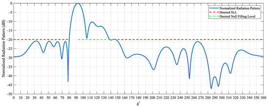 Normalized radiation pattern versus elevation angle at azimuth angle . The maximum value of the normalized radiation pattern (0 dB) corresponds to the actual maximum gain of the AMAA 13.9 dBi at (main lobe tilting by ). The red dash-line shows the desired SLL outside the service area, and the green dash-line shows the desired null filling level inside the service area. The optimal radiation pattern should be below the red dash-line and above the green dash-line.