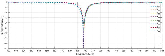 S-parameters of the array elements. All S-parameters are ≤−21 dB at 698 MHz (DVB-T channel 49 center frequency) satisfying the optimization goals.