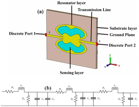 (a) The metamaterial-based sensor: 3D view and (b) its equivalent circuit model.