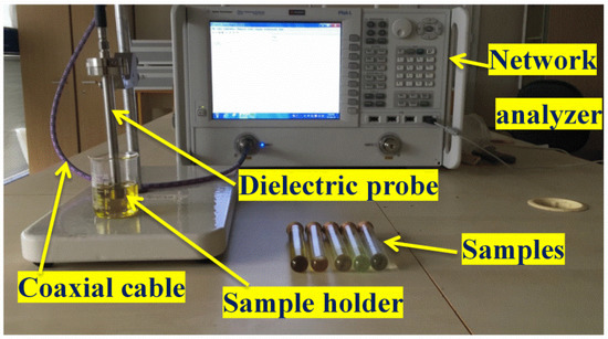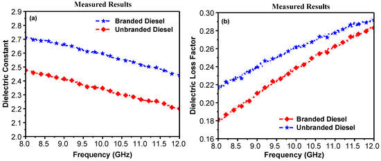 One of the most important parameters of materials is the dielectric constant (), which can be measured using various methods such as the transmission line method, the free space method, the reflection line method, and the resonant method. Each method has its own advantages and disadvantages. The disadvantage of transmission and reflection line methods is limited measurement accuracy due to air gap effects and when the sample dimension is a multiple of one-half wavelength. The disadvantage of the free space method is multiple reflections between antenna and surface. The disadvantage of the resonant method is that it needs a high frequency resolution Vector Network Analyzer (VNA) and it is limited to a narrow band of frequencies only. The open-ended coaxial probe was used in this work to measure the electrical characteristics of the prepared samples (branded and unbranded diesel), as shown in Figure 3. The calibration was performed at room temperature using the Agilent 85070E probe kit. The dielectric constant and dielectric loss factor of the branded and unbranded diesel were measured within the X-band frequencies, as shown in Figure 4a,b.