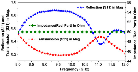 The numerical investigation was carried out by using full wave solver CST (Computer Simulation Technology) microwave software. The obtained results of the reflection, transmission, and impedance magnitudes are shown in Figure 5. In this research, a new mechanism is considered for sensing the materials by observing the possible variations in both of the reflection and transmission amplitudes in addition to the resonant frequency shift. The shift in resonant frequency has only been used by the researchers. One can notice from Figure 5 that the value of reflection spectrum has reached local minima at the resonance frequency of 11.2 GHz, while the transmission magnitude has shown a sharp peak. The impedance of the transmission line was set to be 50 Ω in orders well matched with the two ports.