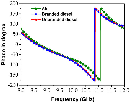 The proposed metamaterials-based sensor integrated transmission line consists of three main layers as mentioned before. The important part is the sensing layer, which acts as a holder to test the samples in. Two oval-shaped holes were produced within the first and second layer. The change in the transmission phase over the frequency range from 8 GHz to 12 GHz was recorded for each of the samples, as shown in Figure 6. The degree deviations in the transmission phase around the resonant frequency with and without the presence of the samples can be interpreted as a sensing agent to the materials under detection. It was concluded that the proposed structure can easily distinguish the branded diesel from the unbranded one by monitoring shifting in the transmission phase.