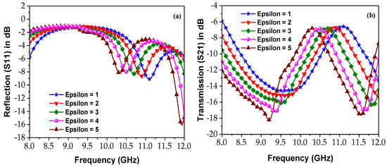 Figure 7 show the reflection and transmission spectral change of the proposed sensor with respect to the change of dielectric permittivity (epsilon) from 1 to 5. It was found that resonant frequency is decreased linearly with the increase of permittivity. The rate of resonant frequency shift was counted to be about 250 MHz. A similar trend of a reduction in the resonant frequency of the transmission spectrum was observed with the increase of permittivity, as shown in Figure 7b. However, the magnitude of the transmission coefficient was seen to increase, while it decreased for the reflection spectrum. The random distributions of molecular dipoles of the liquid samples are ultimately rotated and are polarized in the direction of the applied electric field. This polarization is known as dipole or oriented polarization, which can be described by Debye’s equation with its own relaxation time (τd) [38].
