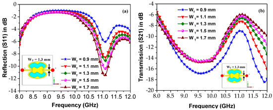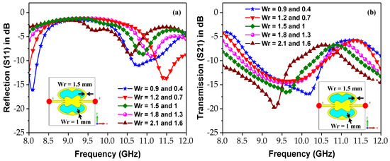 The final parametric study was meant to change the width of the wing resonators. The width of upper and lower wings was modified and the optimum values of the resonator width were found to be 1.5 mm and 1 mm, respectively. The upper width was increased from 0.9 mm to 2.1 mm in steps of 0.3 mm, while the lower width was increased from 0.4 mm to 1.6 mm in steps of 0.3 mm. Figure 11a shows the simulated results of the reflection of the proposed structure. One can see from the figure that a clear resonant shift appears when the width of the resonator is increased and, hence, the resonant frequency shift is about 500 MHz. There exist resonant frequency shifts influenced by the change in the width of the resonator.