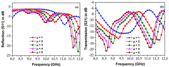 Figure 9 shows the change in resonant frequency and amplitude of the reflection and transmission spectra when permeability of the structure is changed from 1 to 5. It was found that resonant frequency decreased linearly with the increase of permeability over the operating frequency range of 8 GHz to 12 GHz. When the value of permeability was changed from 1 to 5, the resonant frequency decreased from 10.7 GHz to 9.9 GHz. As such, the effect of change in permeability of the sensor layer on the resonant frequency and amplitude increment is clearly seen when the permeability is increased from 1 to 5. We calculated that dependency due to pure diesel is a non-magnetic material. However, the insertion of additives to the branded diesel before it reaches the user makes it susceptible to a magnetic field.
