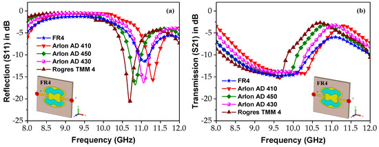 The numerical study for the proposed sensor has been performed by a CST studio suite electromagnetic solver. The data files of the measured dielectric constant and loss tangent were imported into the program. Subsequently, the reflection and transmission coefficients were monitored over the frequency band of 8–12 GHz (X-band), as shown in Figure 15. For the sensing capability of a sensor to be assessed, researchers commonly monitor the trivial shifts in the resonant frequency. In this work, variation in the transmission value is also considered to show the sensitivity of the proposed structure.
