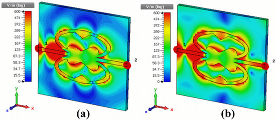 The electric field distributions for the branded diesel sample at the resonance frequency of 8.39 GHz are mostly located at discrete port one with a small concentration around port two. This is where the electric field distribution at the two oval resonators spanned towards port one with less concentration around port two (see Figure 12a). Comparably, the unbranded diesel has led to a lower field distribution at port one. This can be due to the different dielectric behavior of the samples, which was previously seen in Figure 4. It is known that the electromagnetic field can travel through the two ported conductive transmission lines. The field should be in TEM mode, where the electric field and magnetic field components are perpendicular to each other and are perpendicular to the propagation direction. The transmission line is copper, which is a metallic layer and, hence, it is affected by the electric field component of the travelling wave. As shown in Figure 12 and Figure 13, the proposed metamaterial-based sensor allows electric fields and the current flow is bidirectional from the center of the resonator to the ports and vice versa.