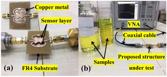 Many techniques and platforms have been applied in sensor construction [8,9,10,11]. Among them, metamaterial-based sensors gained more attention due to unique characteristics such as high sensitivity, small size, low cost, and easy fabrication [12,13,14,15,16,17,18,19]. The most common metamaterial resonance structure is shaped by split ring resonators, which can be integrated with either microstrip structure or transmission line aiming at measuring the dielectric properties of liquids [20,21,22]. A survey of literature revealing that metamaterial-based sensors are applicable in a broad frequency range from microwave to visible [23,24,25] and for various types of materials including solid dielectrics, liquids, gases, and biomolecules [26,27,28,29,30,31]. Ahmet Tamer proposed a metamaterial integrated transmission line based sensor structure to detect authentic and inauthentic diesel and gasoline samples in the X-band frequency range [32,33]. In addition, metamaterials sensor-based on an omega shape and labyrinth resonator have been investigated for industrial implementation and chemical detection [34,35]. Along this line, an efficient metamaterials-based sensor has been presented in the frequency range of 10–11 GHz and 8–12 GHz for determining different branded and unbranded fuel oil samples [36,37]. An effective way of sensing by metamaterial resonators, which is usually considered by researchers, is to monitor the possible frequency shift in the transmission coefficient (S21) or transmission signal (S21) amplitude.