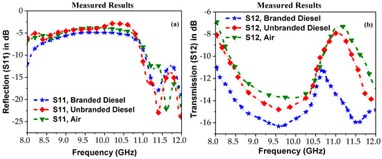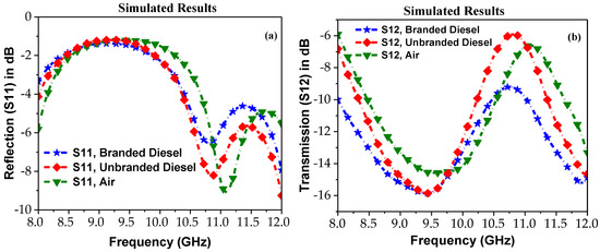 Figure 15a shows that, at the resonant frequency of 10.7 GHz, the reflection coefficient (S11) is about −6.5 dB and −8 dB for the branded and unbranded diesels, respectively. However, in the case of the air sample, the S11 value was about −9.1 dB. Furthermore, the resonant frequency shifts between that of the branded and unbranded diesel is about 120 MHz. Comparably, it is seen from Figure 15b that the transmission coefficient (S21) for the branded diesel, unbranded diesel, and air are −10 dB, −6.8, and −6 dB, respectively. It was observed that, when the sample was changed from branded to unbranded diesel, the transmission value increased by about −3.2 dB. Interestingly, this significant variation of the transmission coefficient in the case of branded and unbranded diesel demonstrates high sensitivity of the proposed sensor.