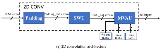 Figure 7a illustrates the architecture of standard 2D convolution. There were mainly three parts in 2D convolution: padding, SWU, and MVAU, and the padding was optional. For standard 2D convolution without padding, the matrix size of OFM would shrink after each layer, which meant the spatial information at the boundaries would be lost. To preserve low level features, we recommend applying the padding operation before 2D convolution. The size of zero padding was applied around the border of the IFM. SWU was used to reorganize the IFM according to the sliding window (kernel) size and prepare for faster convolution in MVAU, and MVAU output the OFM stream. Figure 7b is the structure of pointwise convolution. The convolution would not affect the matrix size of OFM. Thus, padding was eliminated. Furthermore, there was no need for SWU to reorganize the IFM. Finally, pointwise convolution only had the MVAU module. In Figure 7c, we concatenated pointwise convolution and 2D convolution and grouped them as a module called the P2D module.
