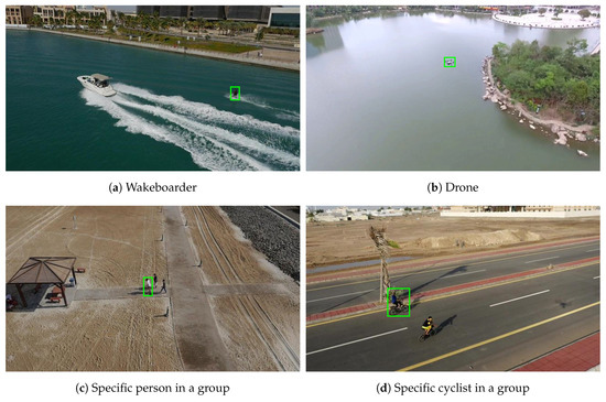 The dataset [9] had 12 categories for UAV application. As shown in Figure 10, there were several challenges in the dataset. (1) Since it was in a UAV scenario, most of the object that needed to be detected only took a tiny portion (1–2%) in the whole image with the size of 640 × 360 (as shown in Figure 10a,b). The detection accuracy was very sensitive for such a small size. (2) The detection task only focused on a specific object if there were multiple objects, e.g., in Figure 10c, there is a group of people in the captured image, but only one specific object needs to be detected and localized. In Figure 10d, only a specific cyclist needs to be detected. (3) There were obstacles in the images, e.g., the cyclist in Figure 10e is covered by the caption, the person in Figure 10f is partially covered by the tree, etc. (4) The lighting was different. As shown in Figure 10g,h, the scenarios were captured in a low light case.