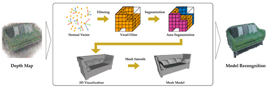 Normal estimation is a process of estimating the normal of a face when each point in a set of points forms a face, and filtering is a process of removing the noise based on the calculated normals. Segmentation is the process of grouping a set of points that form the same object around the normals from the noise-free data, and model estimation is the process of estimating the shape of the object based on each segmented group.