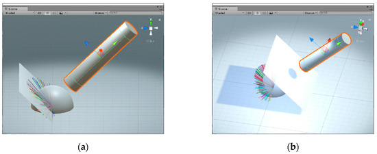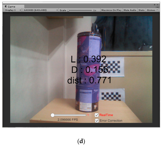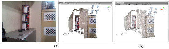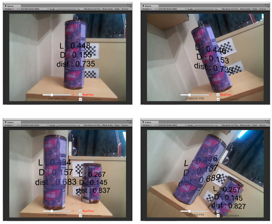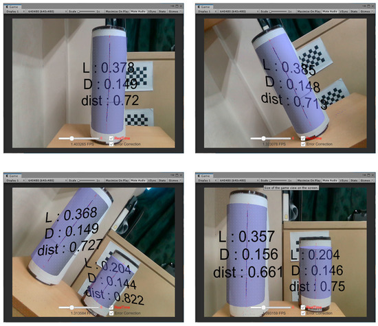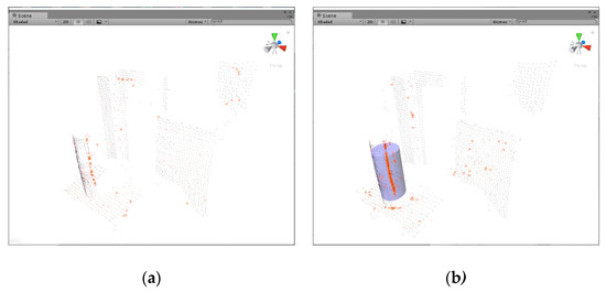 As shown in Figure 13a, the cylinders used for the experiment were constructed using three cans of 15 cm in diameter and 16 cm in length as shown in Figure 13b. For the constructed data, the single frame cylinder estimation is shown in Figure 13c. The experiments used Unity3D on laptops equipped with an Intel 8250U CPU operating at 3.40 GHz and 16 GB memory.