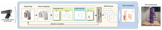 Jimeno-Morenilla proposed real-time footwear matching using a glove system that can control a 3D model and a magic mirror. In particular, the infrared emission sensor was attached to the foot to measure the position and direction, and the 3D shoe was augmented to complete the magic mirror [22]. Based on the above research, after a real-time pipe measurement using a point cloud, the augmented reality visualization method first acquires a point cloud from a depth image and downscales it as shown in Figure 3. After that, the center axis estimation using the variable scale is performed for the pipe estimation. After estimating the exact pipe by accumulating the estimated results, the augmented reality is constructed/completed by integrating the actual image and the estimated object.