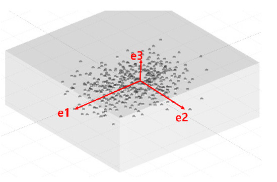 The radius and center point of the sphere can be calculated by defining a mathematical model. A set of traces using spheres can be used to estimate the direction, which can be assumed to be the central axis of the cylinder. Therefore, a straight line must be modeled to estimate the central axis. At this time, principal component analysis is used to model the straight line. Principal component analysis (PCA) is a statistical approach to estimate the directions e2 and e3, which are perpendicular to the directions e1 with the largest variance of data as shown in Figure 5 [25,26]. Therefore, when e1 is found, the direction of the cylinder central axis can be known. Principal component analysis constructs a covariance matrix and obtains a direction vector by eigen-decomposition of the covariance matrix.