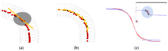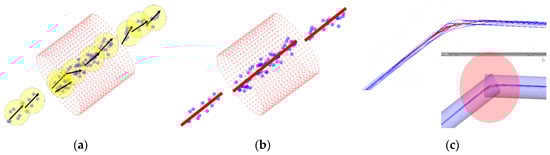 Figure 6 depicts the estimate of the central axis, where Figure 6a is the result of calculating the eigenvectors based on the neighboring points at one point, and Figure 6b is the sum of the eigenvectors. This is the result of estimating the direction and length. At this point, the constant criterion is the distance and angle of the two vectors. In other words, if the angle and distance formed by the two vectors are within a certain range, then they are considered as one vector. At this time, the radius average of the central axis candidate group that constitutes one vector becomes the radius of the cylinder. Figure 6c is a result of matching a straight line through the sum of the blue eigenvectors.