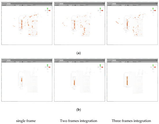 Figure 11a shows the results of the central axis estimation from the point data acquired in each frame, and Figure 11b shows the results of accumulating and filtering the results of Figure 11a.