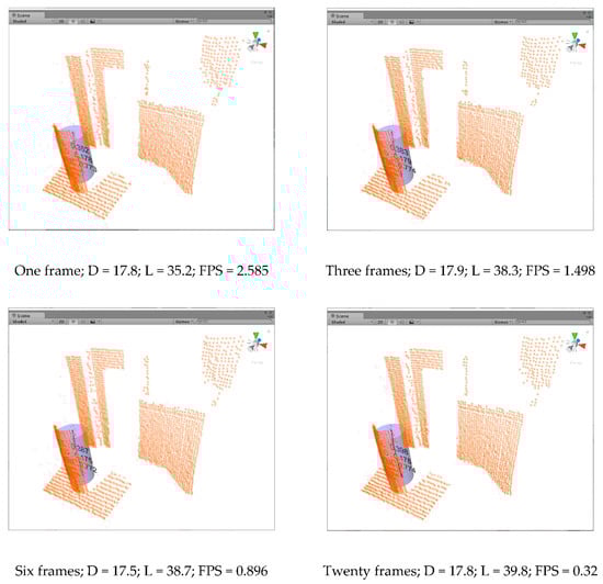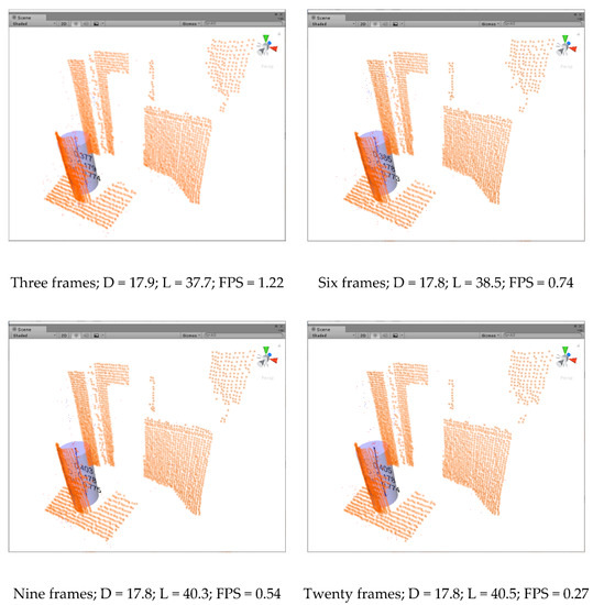 Once a uniform point cloud is complete, real-time cylinder estimation is possible. However, the cylinder estimation using the data obtained in one aspect is inevitably lowered. Therefore, rather than estimating cylinders for each frame, estimating cylinders by incorporating several frames with sphere fitting is one way to increase accuracy. Figure 11 depicts this process.