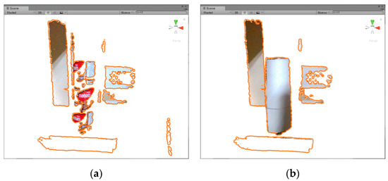 Mahmood proposed a RANSAC-based false correspondence rejection method to increase the accuracy in registration and correspondence estimation required for interaction in augmented reality devices [18]. Kung extracted planar and curved regions using supervoxel segmentation for AR devices [19]. Pavez studied the compression and expression of the polygon cloud, which is the middle between the polygon mesh and the point cloud on the AR device. A dynamic polygonal cloud has the advantage of temporal redundancy for compression; thereby, they proposed compressing static/dynamic multiple clouds [20]. Cazamias used depth images for the real-time processing of technology to create virtual spaces based on real spaces [21].