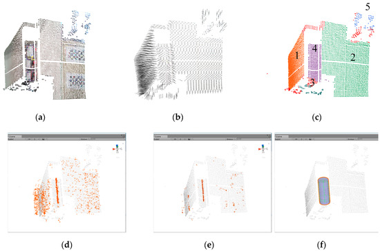 Figure 24b shows that the normal estimation was well done. Figure 24c shows the results of segmentation based on the estimated normal. As a result, the segmentation was also performed well. However, in the process of confirming what type each group is based on the divided data, the cylinder shape was not predicted. In order to perform the Hough transform, the above process must be performed. Therefore, the existing method can no longer perform the cylinder estimation procedure. On the other hand, the fast cylinder matching method using RANSAC was able to estimate the central axis candidate as in (d) and filter as in (e), and as a result, predict the cylinder relatively accurately as in (f).